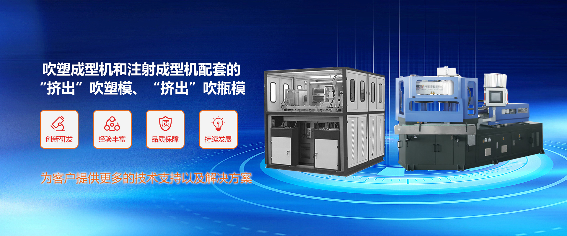 公司可為廣大用戶提供:吹塑成型機(jī)和注射成型機(jī)配套的“擠出”吹塑模、“擠出”吹瓶模、三工位“注--吹”模、PET瓶坯模、PET瓶坯模、熱流道瓶蓋模等,公司專注注吹模具設(shè)計方面技術(shù),可為使用國外各種品牌(如美國的WHEATON、美國的JOMAR、意大利的UNILOY等)全自動三工位“注吹”成型機(jī)的吹瓶廠商提供模具配套,同時也可為國內(nèi)全自動三工位“注吹”成型機(jī)制造公司提供模具配套服務(wù)。